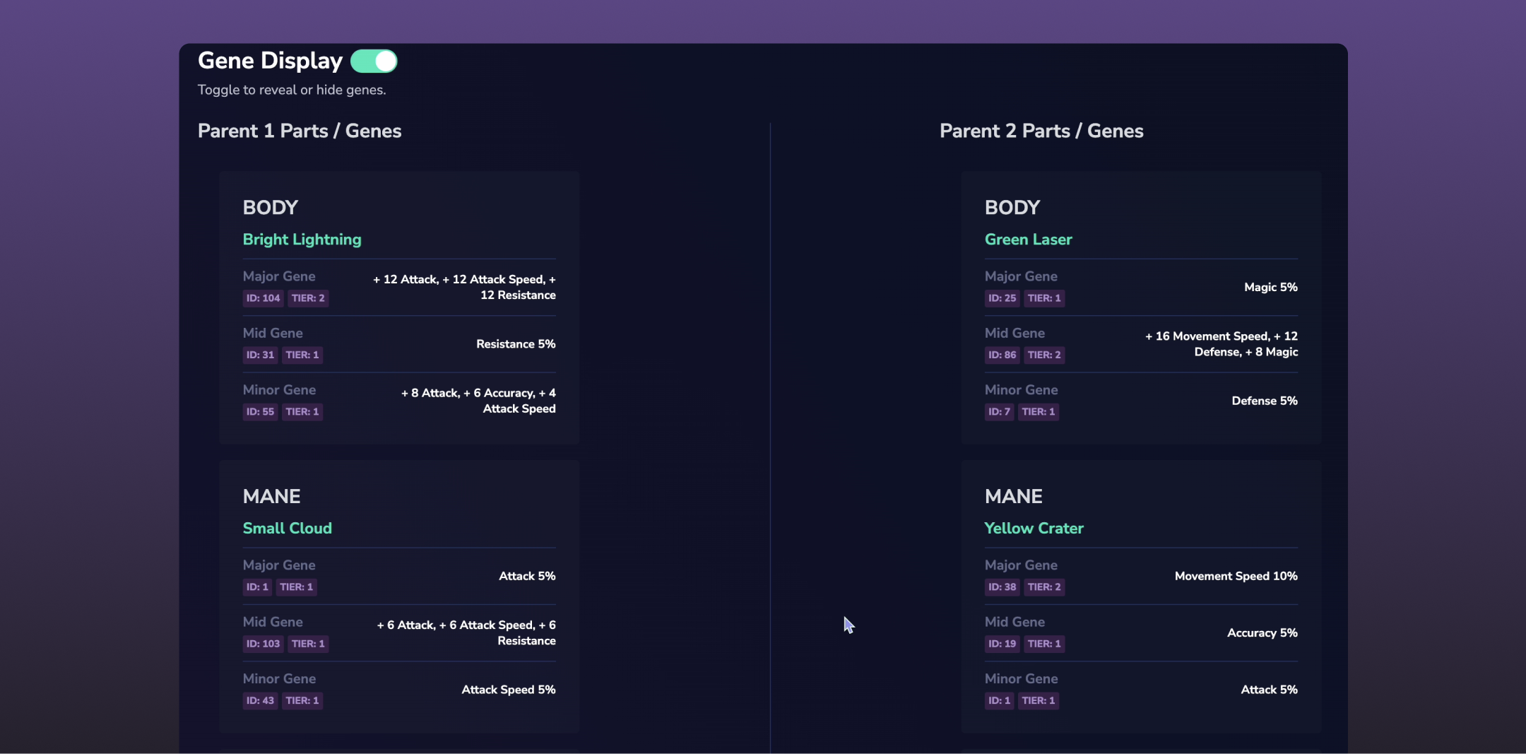 The Genes Display offers genetic deep-dives for advanced "min-maxing" players.