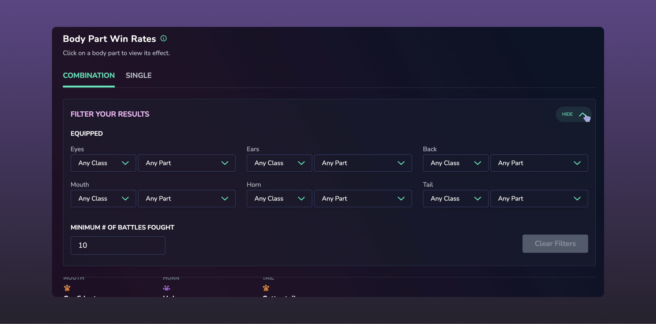 I designed and built an intuitive Breeding Simulator that players of all levels could benefit from. A user starts by selecting two parent unicorns from their collection, then the tool instantly runs hundreds of genetic simulations based on the game's official rules. It presents a comprehensive forecast, showing the probable classes, potential body parts with their inheritance odds, and the projected stat ranges of the resulting offspring.